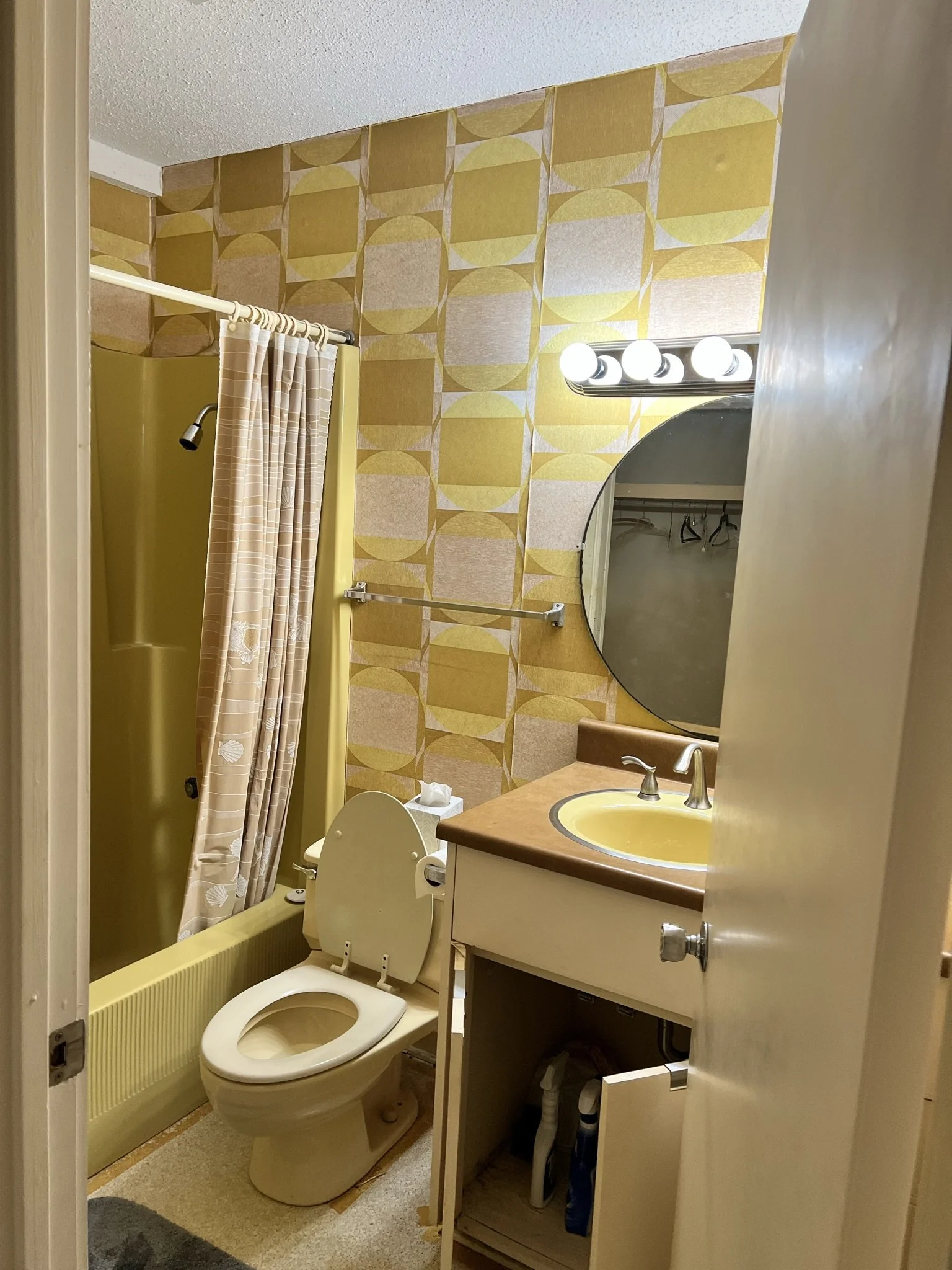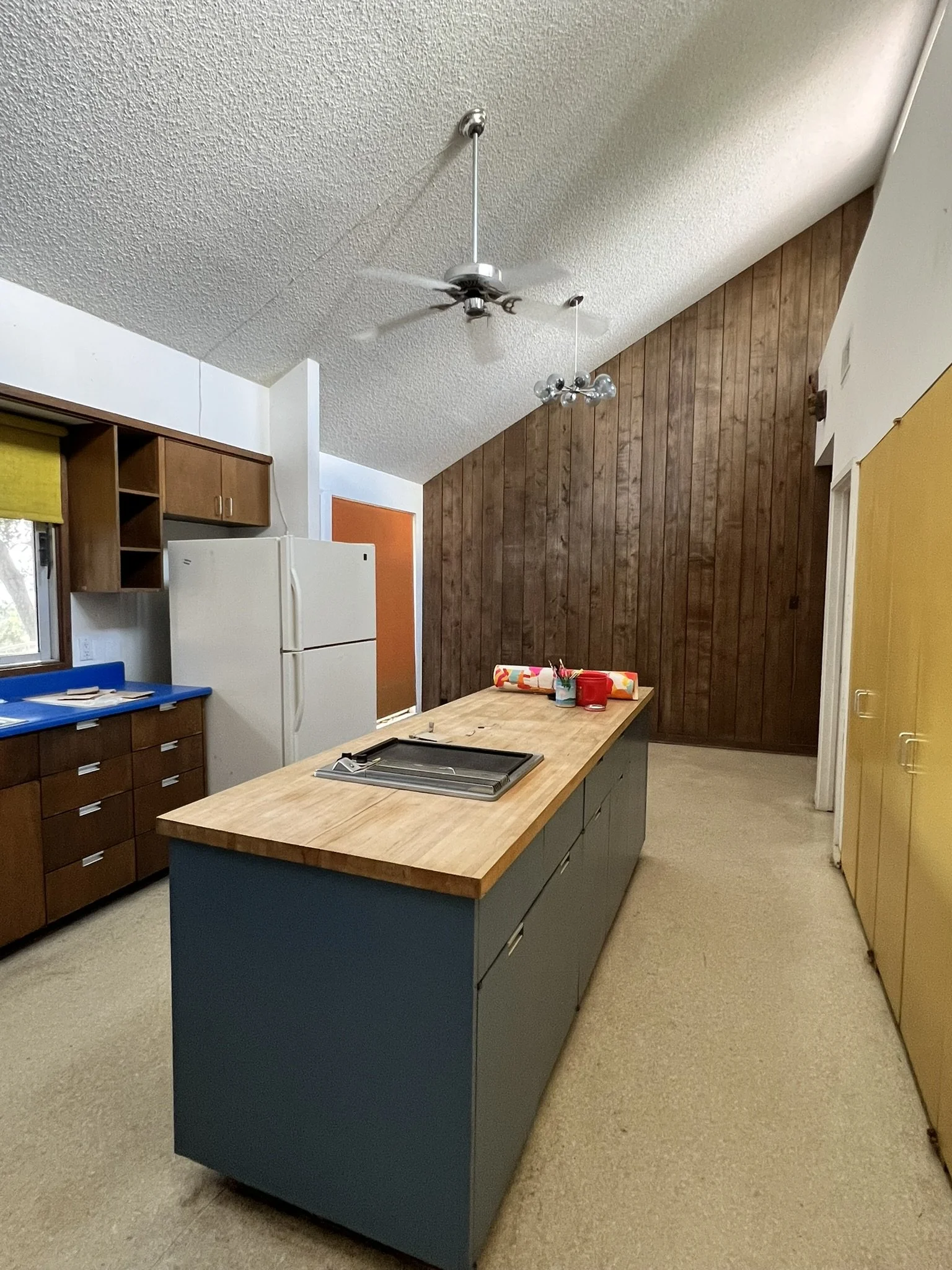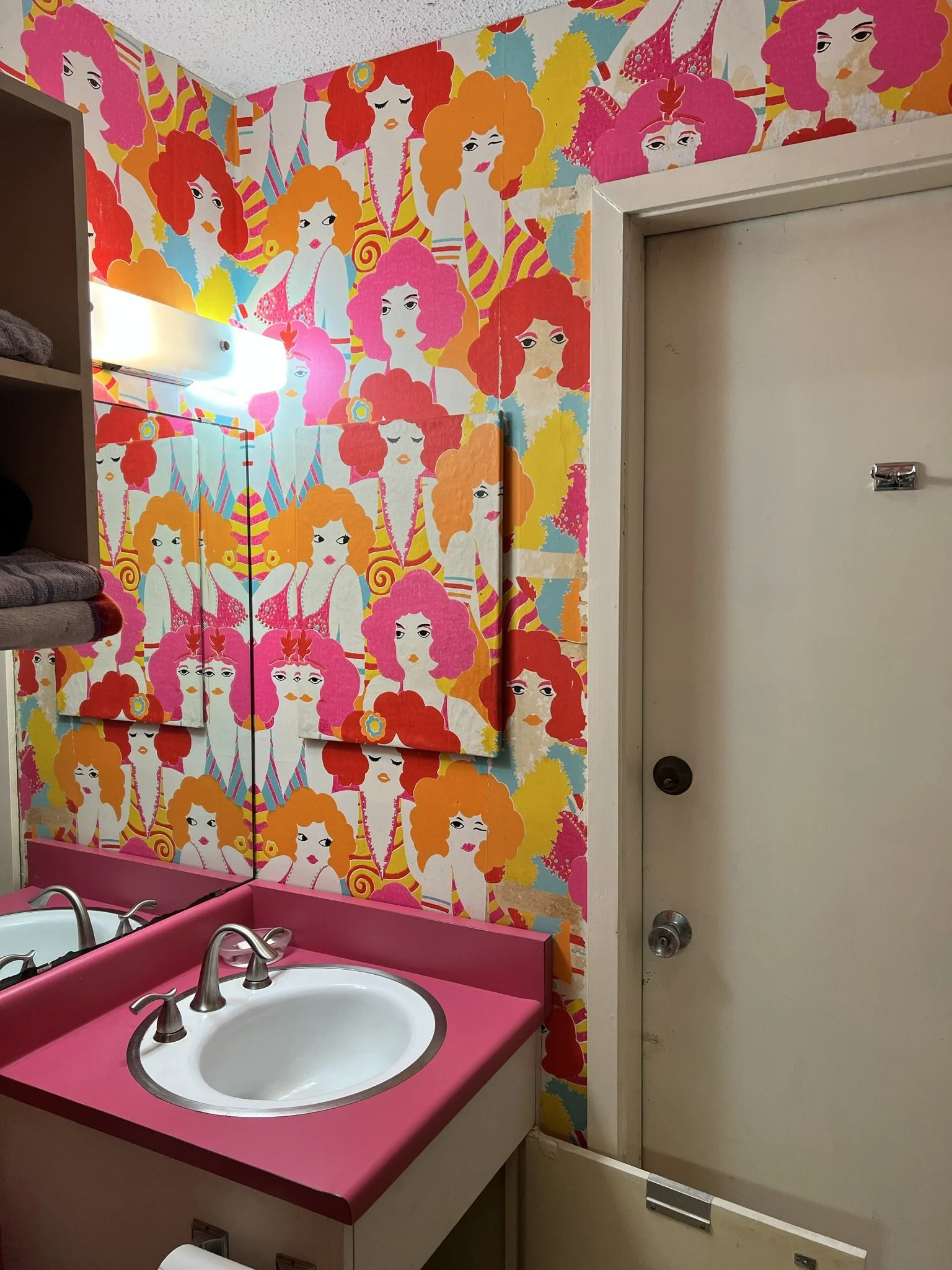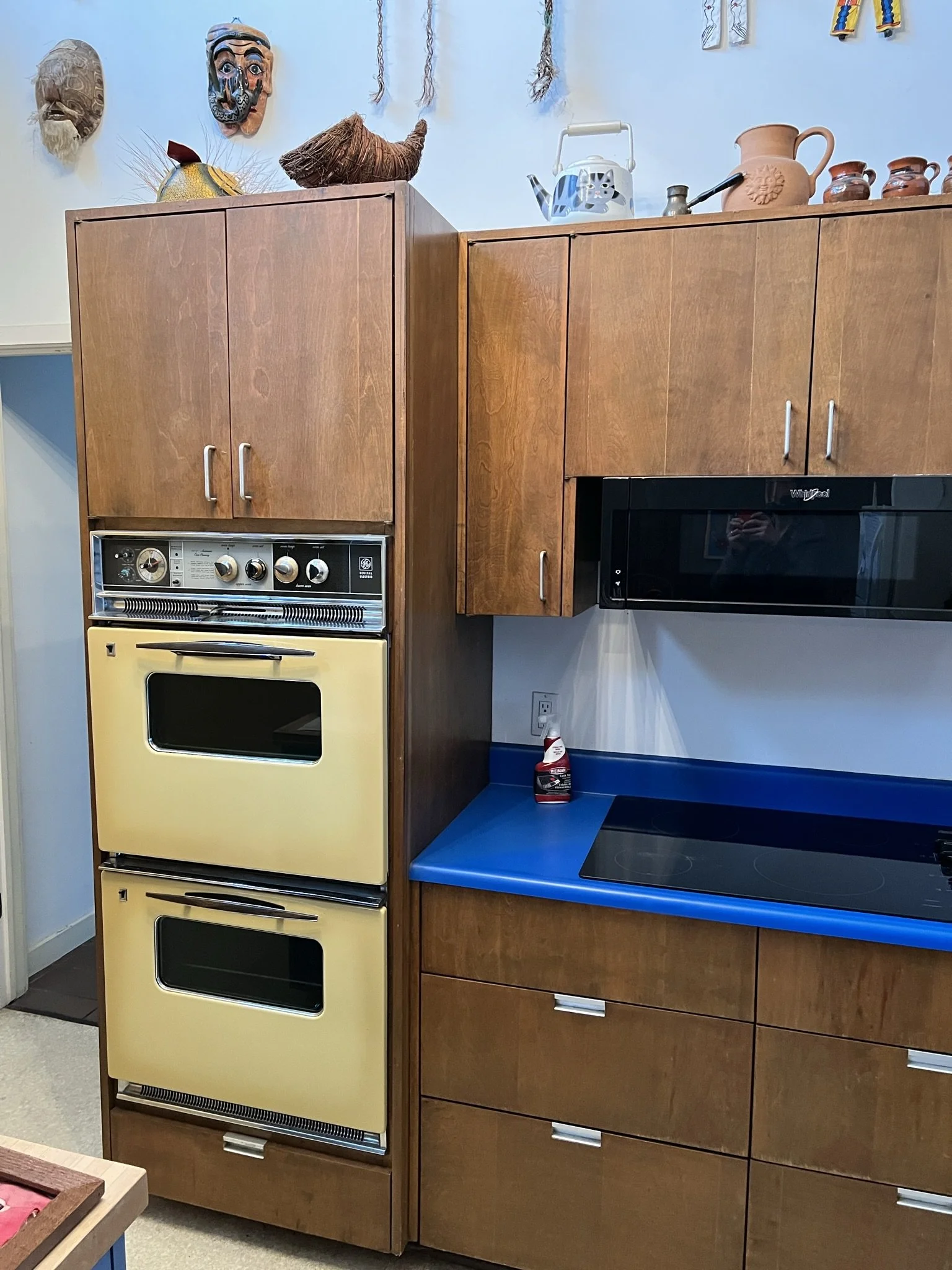 Inspired by the homeowner’s cherished blue Lapis ring, the new kitchen cabinetry brings a bold yet personal touch, while a portion of the original countertop was salvaged and repurposed. In a nod to the home's history, a section of its funky 70s bathroom wallpaper was preserved and framed as a unique feature in the updated space. The result is a thoughtful blend of past and present—preserving the home’s spirit while preparing it for decades of worry-free living.