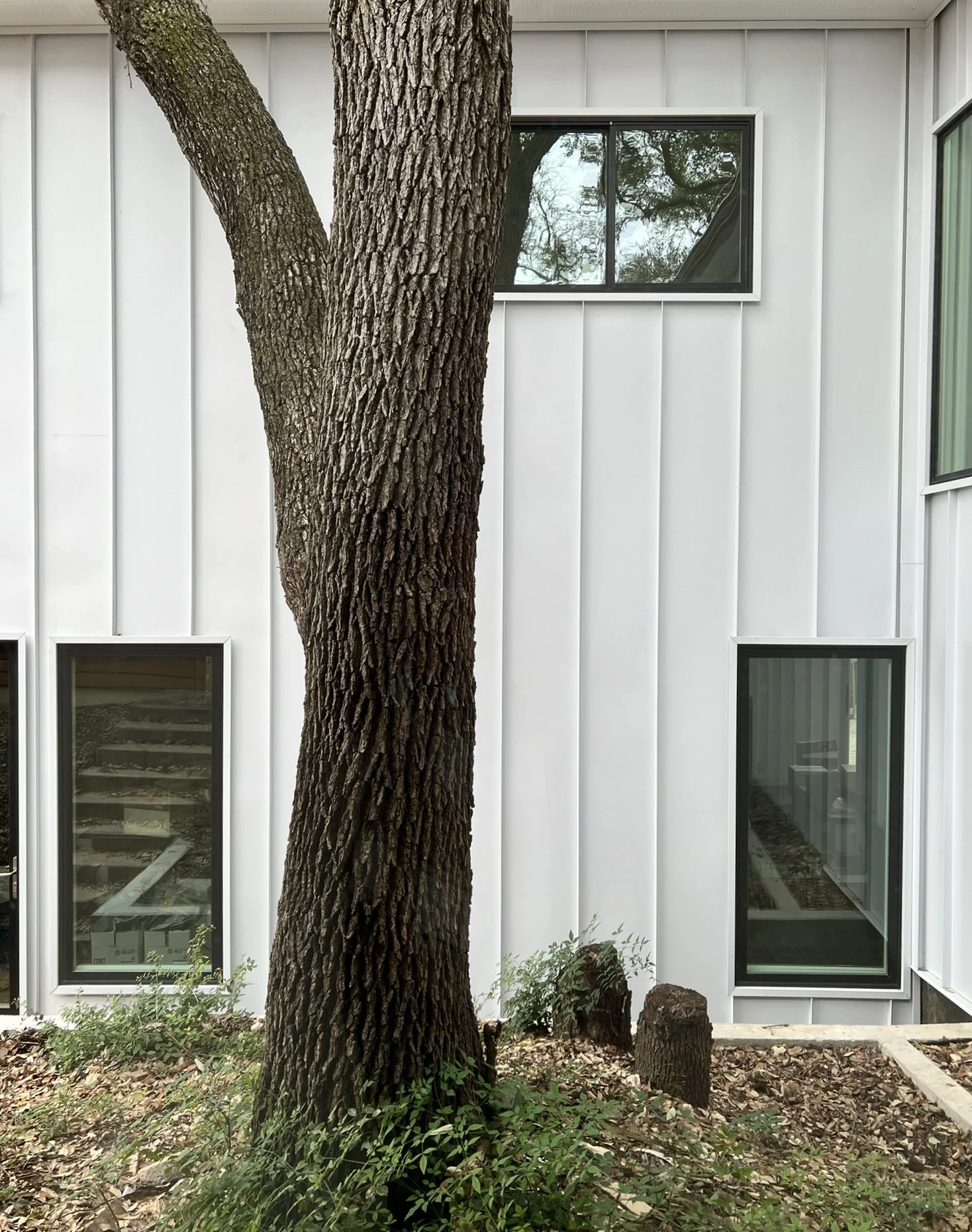 This split-level home, originally built in the early 1970s, embodies the Contemporary Shed style popular from the mid-60s to the early 90s. The longtime homeowner, seeking to honor the house’s original character while ensuring long-term durability, prioritized low-maintenance materials for the renovation. The deteriorating siding was replaced with sleek, white Kynar-finished standing seam metal, and all doors and windows were updated for efficiency and style. Inside, the kitchen and dining areas were opened up, with added windows and doors creating a bright, airy atmosphere.